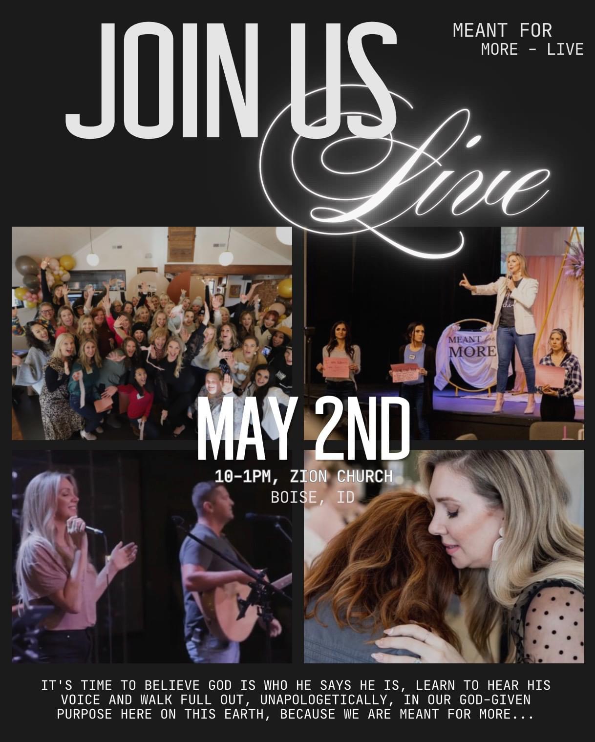 God imparted and called Charity to create the "Meant For More" ministry and movement after going through the journey of losing a child...after journeying through the dark night of the soul and finding true healing as well as the impartation that each of us are divine miracles formed and fashioned by a Good Father, that we are each here on purpose for a purpose and that He works ALL things out for good, she is on a mission to ignite and equip the Bride of Christ to walk full out in her identity and to see the More of God manifest here on earth.